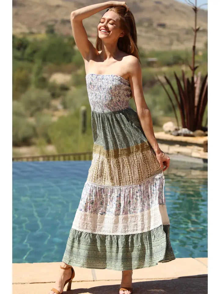 Great summer strapless dress. Looks cute with our denim jackets.